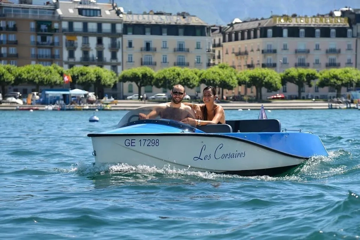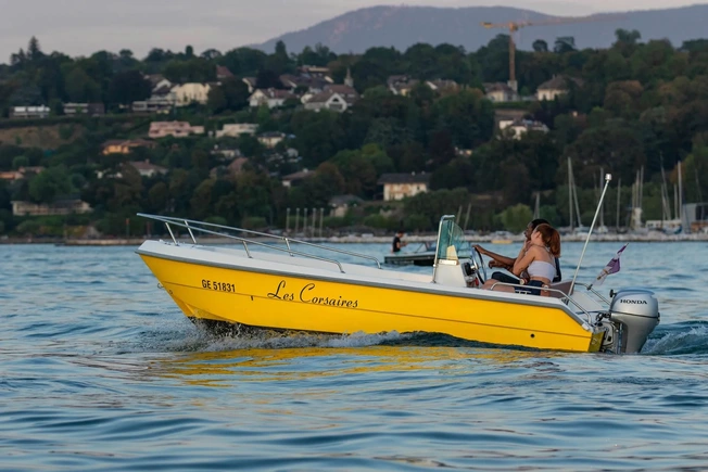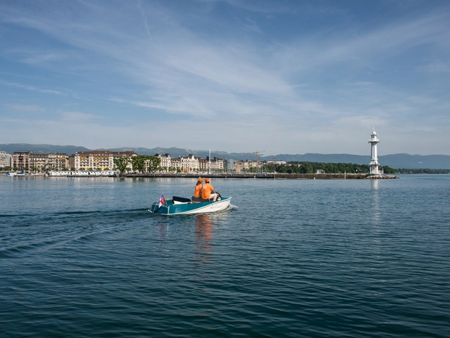 An air of freedom, a panoramic view of Geneva and its surroundings at the helm of a motor boat, enjoying a swim away from the world.
