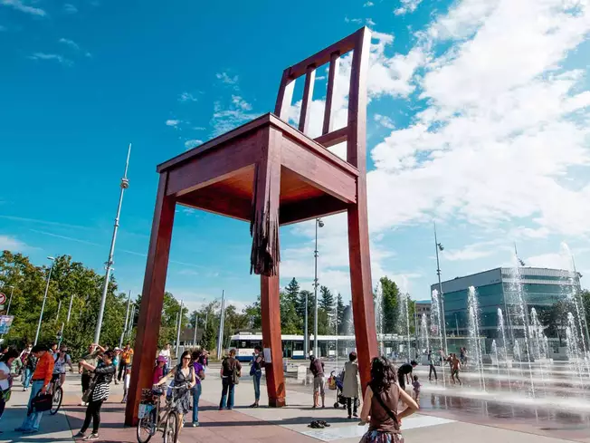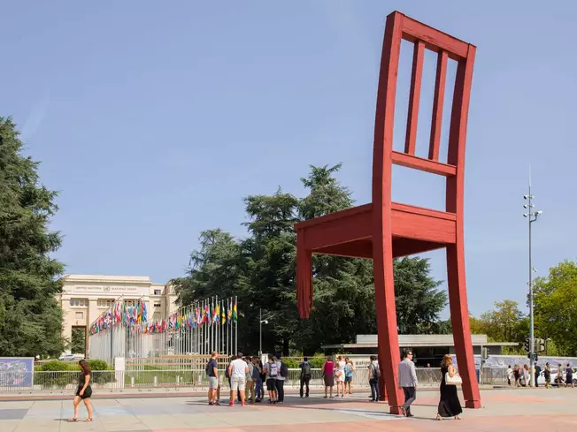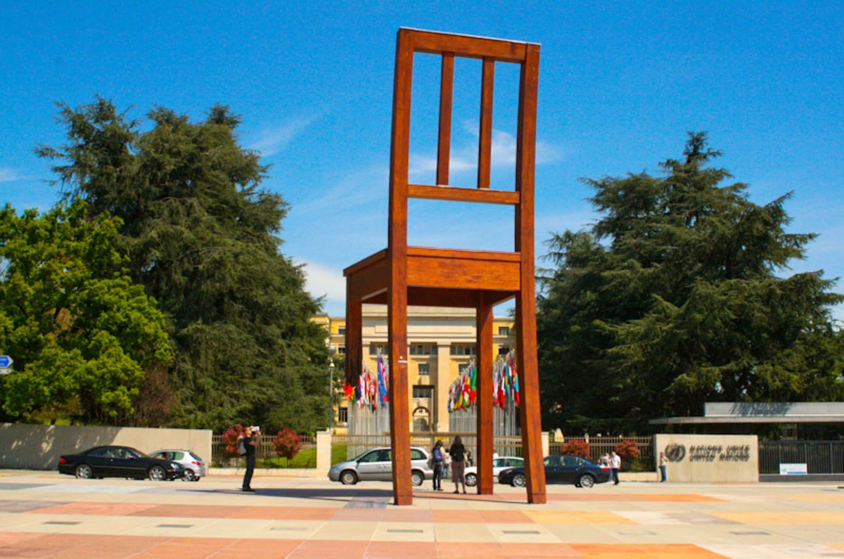 Broken Chair is the work of sculptor Daniel Berset. It was made in 1997 for the NGO Handicap International. Made out of 5.5 tonnes of wood and standing at a height of 12 metres, this impressive work of art has been dominating the Place des Nations since 1997. Its message is simple: remember the victims of landmines, urge your government to promote a ban on landmines. Think of making a stopover here before heading further to visit the international district.