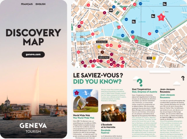 Discover Geneva at your own pace with the "Discovery Map"! This essential guide for tourists highlights must-see attractions, provides transportation information, and shares fun anecdotes about the city. Whether you're exploring historic sites, or strolling by the lake, this map is your key to uncovering all the treasures Geneva has to offer.