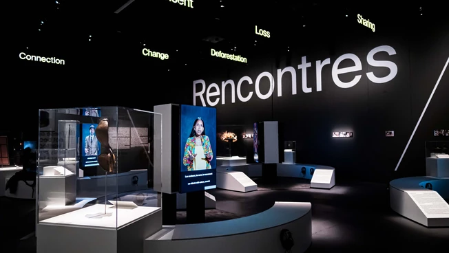 The MEG is an architectural symbol in the Plainpalais district. The MEG is a museum that addresses major issues facing human societies today and offers a perspective on global societal and environmental challenges. Its collections are to be discovered in magnificent exhibitions, whether permanent or temporary, which highlight the museum's treasures through fascinating immersive scenographies. The permanent exhibition offers a journey titled "Dialogue," which explores objects with ethical issues, such as stolen items, human remains, or sacred objects. This journey traces the exchanges with source communities to determine the legitimacy of their presentation. "Dialogue" will evolve over time, adapting to new research and collaborations. The permanent exhibition is complemented by another exhibition titled "Encounters," which examines the relationship between communities and museum collections. Through a series of portraits and interviews, individuals share their personal connections with objects from the MEG collections. In contrast to these historical testimonies, visitors can immerse themselves in societal issues by exploring temporary exhibitions. In 2017, the MEG received the prestigious EMYA Award, the European Museum of the Year Award, the highest distinction for a museum in Europe. Designed as a true cultural hub, the MEG offers a wide range of activities: performances, concerts, conferences, film screenings, workshops, and guided tours are just a sample of the experiences available to the public in connection with the exhibitions. It also features a café, a library, a music lounge, and a flower-filled esplanade.