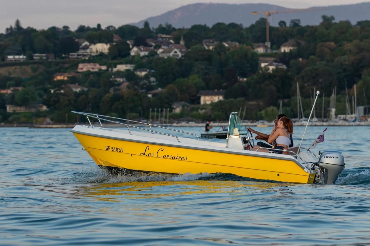 An air of freedom, a panoramic view of Geneva and its surroundings at the helm of a motor boat, enjoying a swim away from the world.