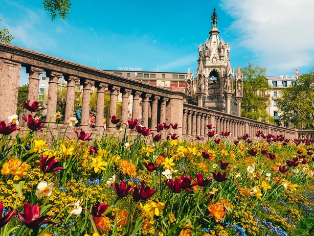 The neo-gothic Brunswick Monument, built in 1879 in Jardin des Alpes, honors eccentric Duke Charles d’Este Guelph.